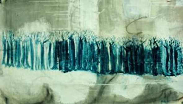 André Clouâtre, Tempête de neige, Acrylique sur papier 52 X62 cm, 2011. $200Je suis le peintre de mes lieux et de mes temps. J’aime la montagne couverte d’arbres et les reflets qu’Ils font sur le lac.