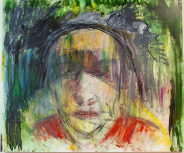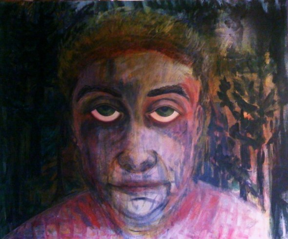 André Clouâtre, Visage sur fond vert, Acrylique sur papier marouflé sur masonite, 115 x 137 cm, 2011J’ai présenté ce tableau, Visage sur fond vert, dans sa version initiale en décembre 2010, à l’exposition que mon groupe , Espace 9, a organisé aux Ateliers du Capitol à Montréal. Il a suscité un certain intérêt. Un des commentaires qui m’a frappé est que «cet homme ne se révèle pas». Ne l’ayant pas vendu, je l’ai retravaillé ce printemps, en affirmant ses traits et le décor forestier qui l’entoure. Je l’expose en juin 2011 à la 27ième Exposition annuelle de l’Atelier du geste (http://atelierdugeste.qc.ca) .André Clouâtre, Visage sur fond vert, version initiale, 2010