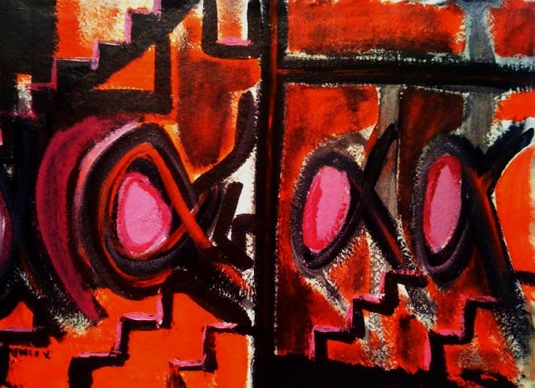 I followed the harsh path of abstraction by intuition and improvisation. Af some point, symbols emerged: the greek letter alpha in one painting and the 0,1 of the binary numbers in the other. My mind got calmer because I know and I like these symbols. They evoke my classical studies and my love of mathematics. I terminated the paintings thinking about the contemporary digital tumult.