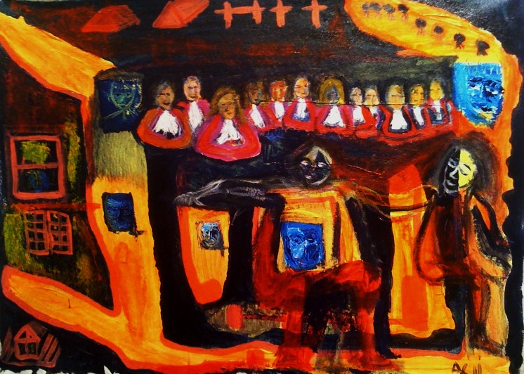 Tableau réalisé en deux temps. La première version représentait une structure d’enfermement, en jaune et noir, couleurs qui ne me satisfaisaient pas. Une semaine plus tard j’ajoutais une kyrielle de personnages inspirées par des photographies du journal Le Devoir.