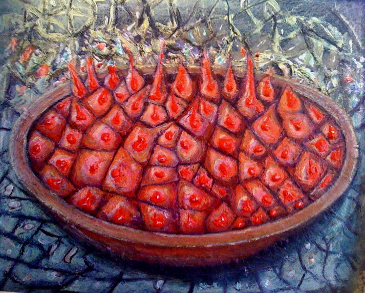 I first divided the surface into small polygons of 3, 4 or 5 edges. Then, I delimited an offering zone with a bowl made of cut paper. I choose the red as the dominant colour for its attractive power.