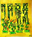 Cette semaine, j’ai peint en jaune des toiles d’un mètre carré. Ce sera mon point de départ pour mes travaux des prochaines semaines. J’ai fait quelques essais sur des cartons de 6 pouces carrés, rien de bien défini car je ne sais pas encore quels seront les thèmes que je développerai.
