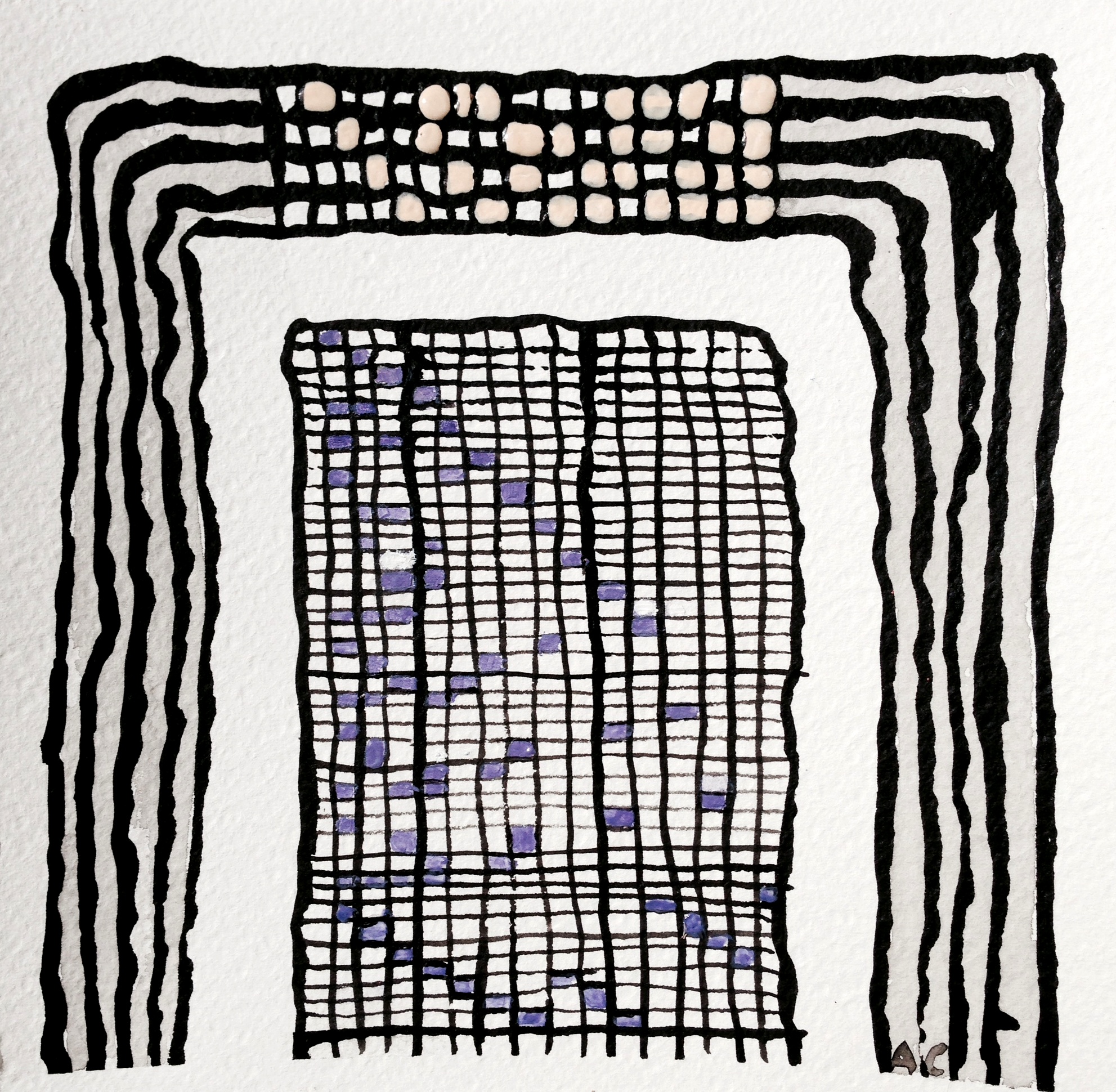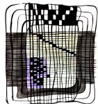 These drawings are about lines, combinations of lines, and placement of colours at some specific grid positions. The specificity is the independence pattern: the lines at the bottom part are kind of paragraphs of independent sentences (which have none of the four basic parts (16 combinations-sentences at the top) in common). I repeated this exercise many times until I came to accept my ambition and my limitation. Afterward, I took pleasure in adjusting the black and white contrasts and the attraction power of colours.