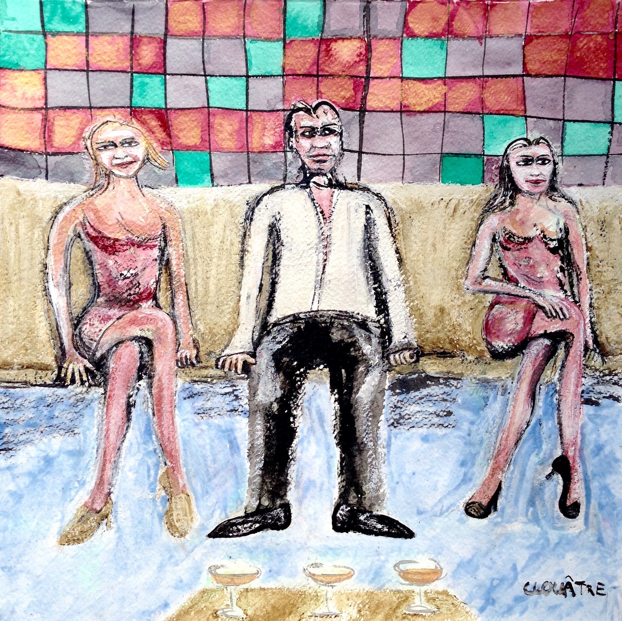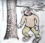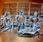 This is a sample of preparatory drawings. I will finalize them for a next fall gallery show. I draw repetitively the same scene. I want to attain fluidity in my gesture. I also search for an expressive placement of the personages. I experiment with diverse supports and materials. The scenes come from my dreams.