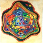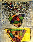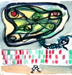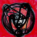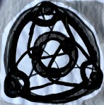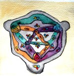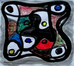 So… just for you readers, here are my February drawings and paintings on Combinatorial subjects. I play with the positive and negative versions of 3 ( or 4) points which define 8 (or 16) overlapping sets. Meaningful arrangements of these objects create forms that I emphasize. In some works, I associate human forms to the points and create vignettes.