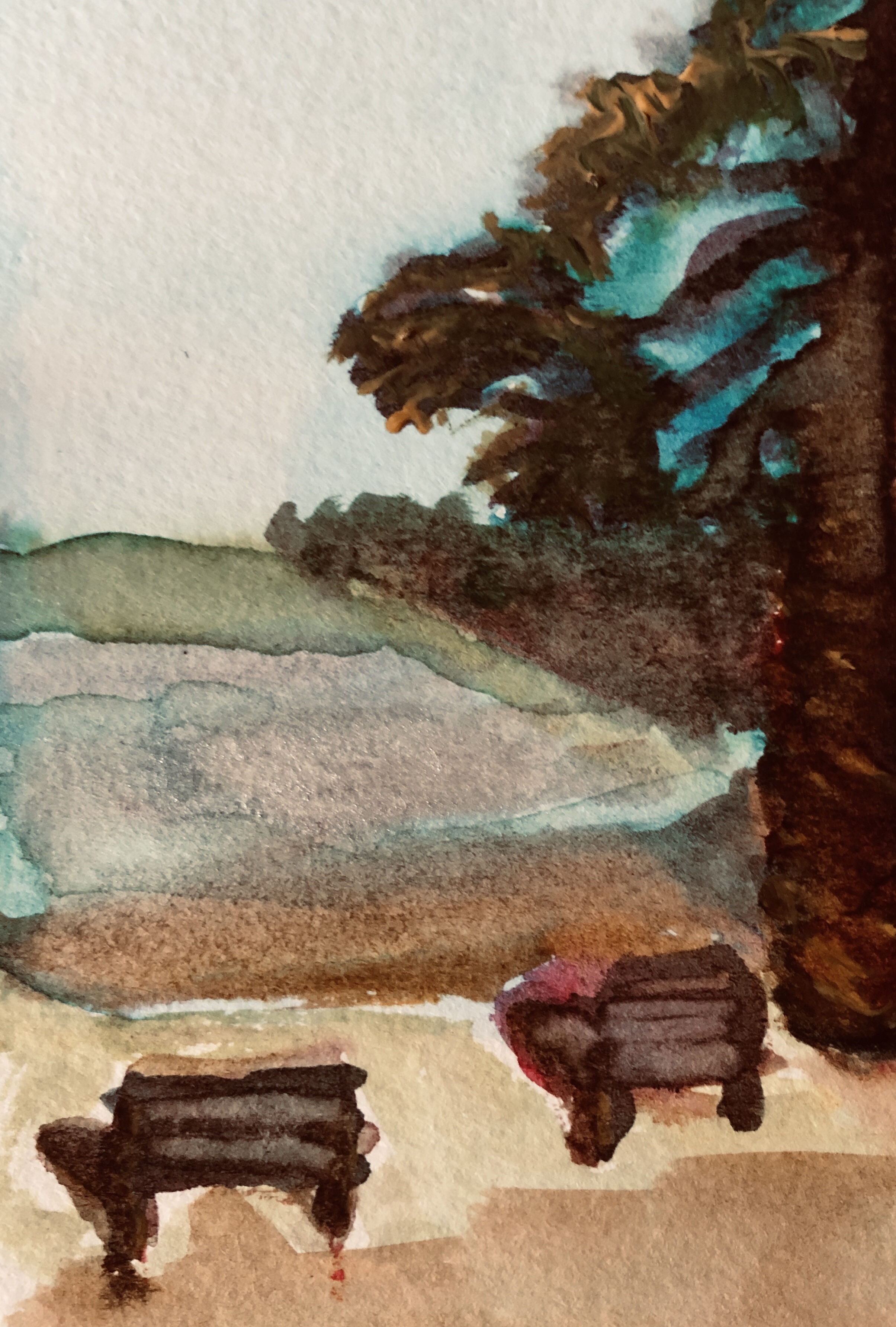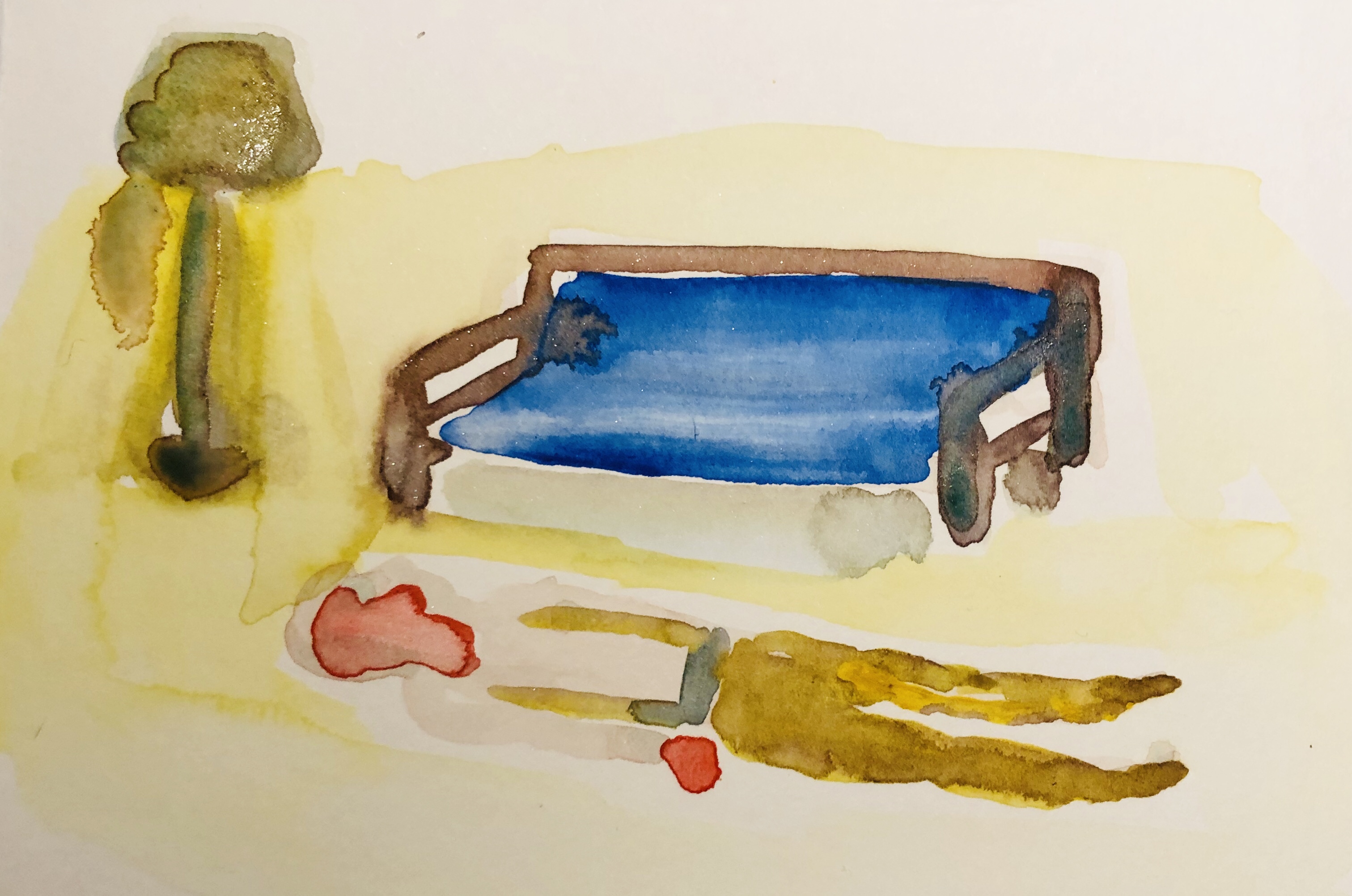 Je fais de petites aquarelles le soir dans ma chambre, durant ce voyage. Sans ambition particulière, j’y cristallise en images des idées ou des scènes vécues durant la journée.