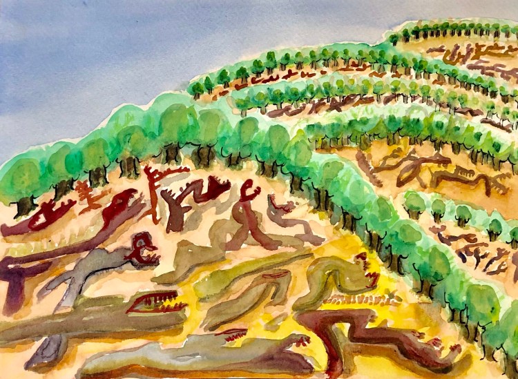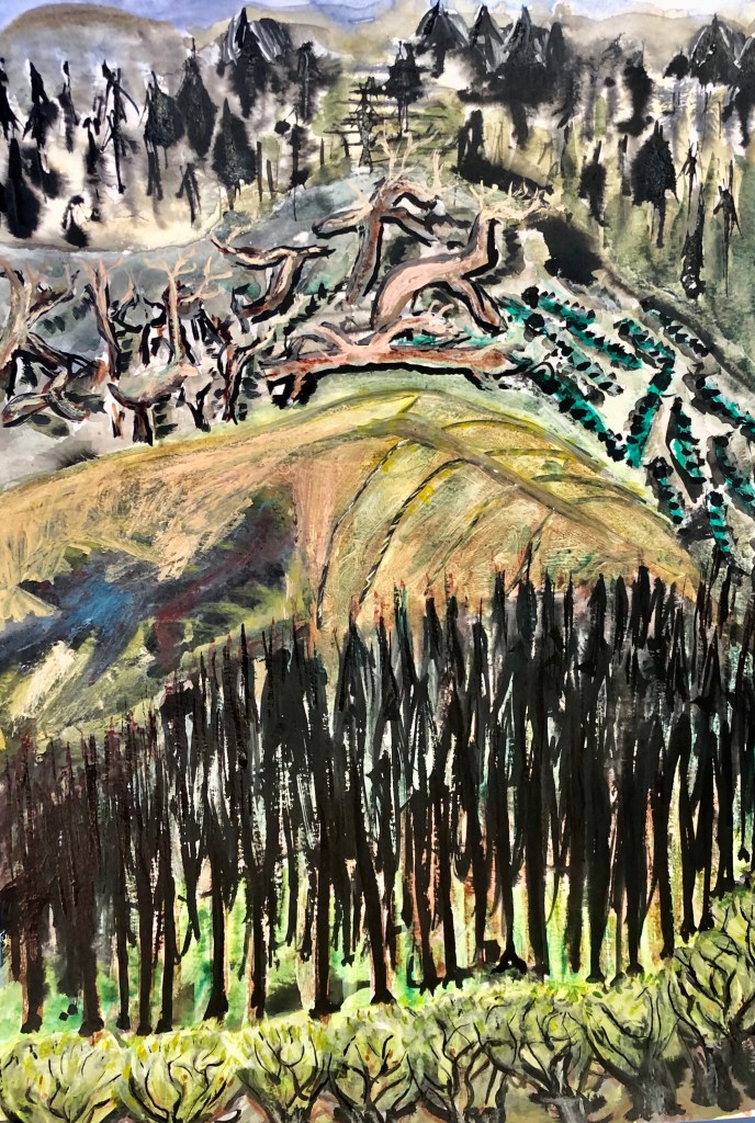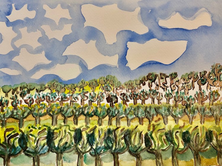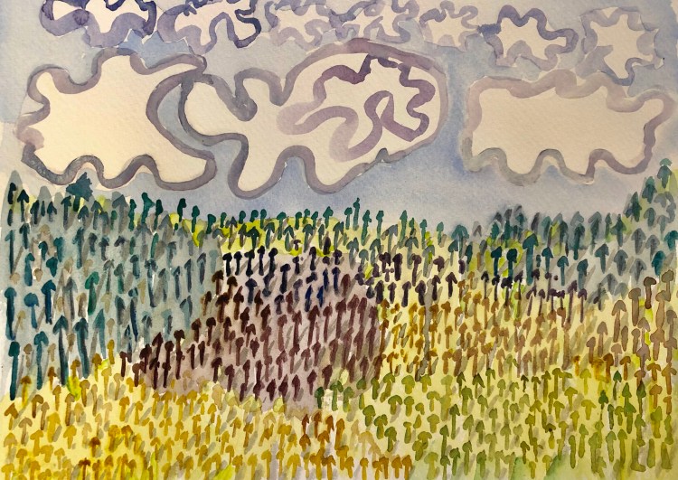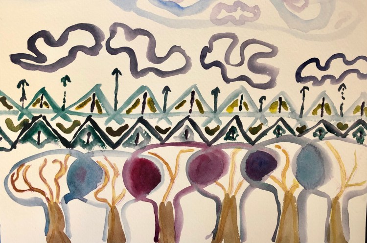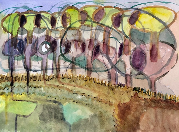 Je me promène dans une forêt ancienne, centenaire. Des parfums, parfois doux, parfois acidulés, me stimulent à la gaieté. J’admire un arbre rayonnant de vigueur, j’enjambe des contorsions de racines , je m’étonne de la résistance d’un vieil arbre tordu, je me désole devant des arbres déracinés par le vent, j’aperçois une montagne au loin, je vois dans une clairière une multitude d’herbes, de fougères et de fleurs. Lorsque le soleil est à son zénith, je circule au frais à l’ombre. L’ombre ralentit l’évaporation de l’eau, des mares se créent, des animaux de toute taille s’en réjouissent…