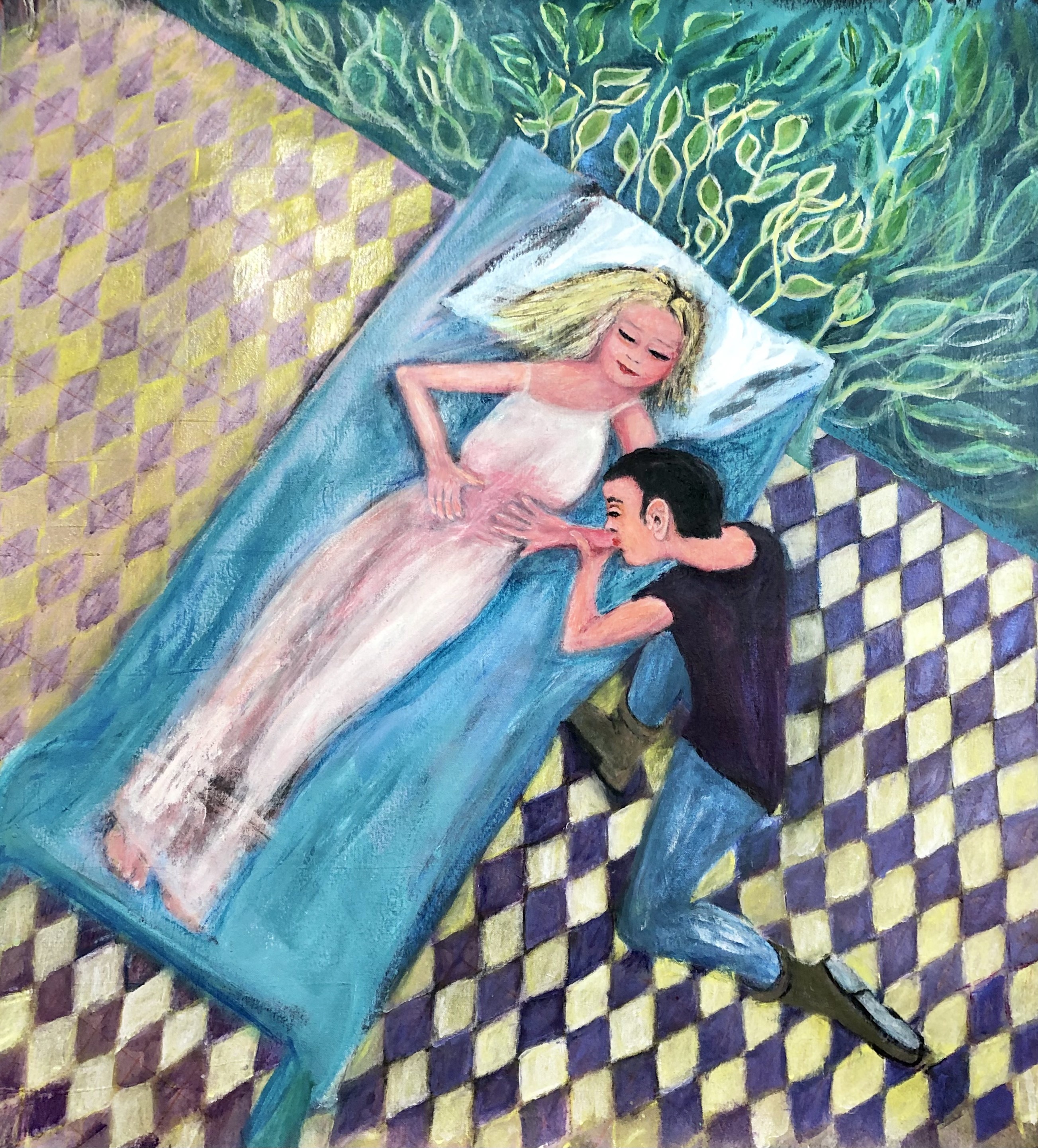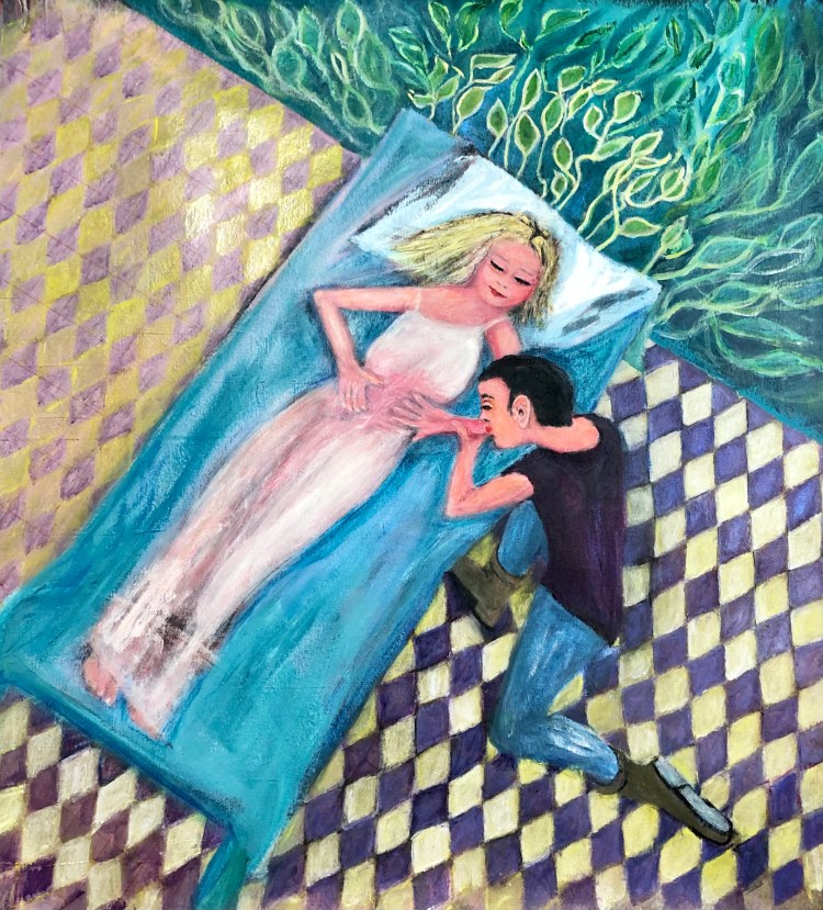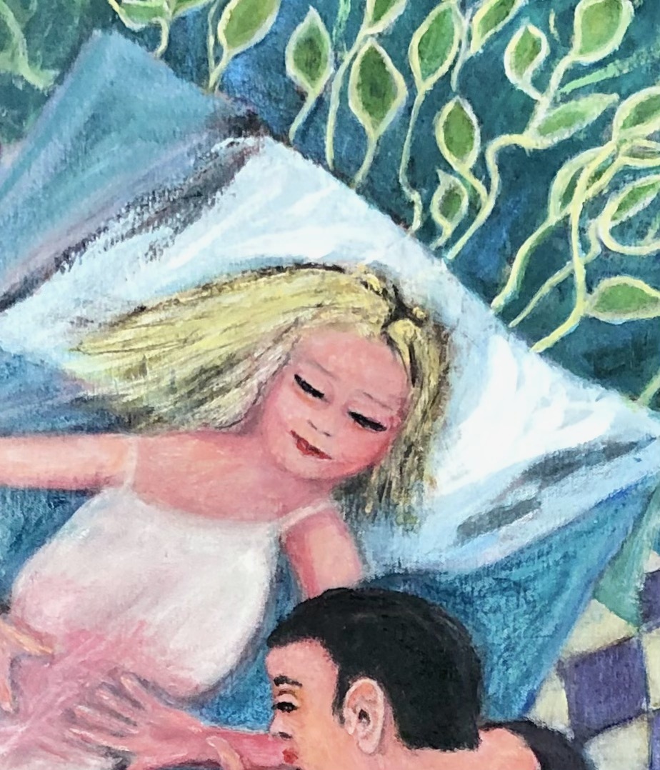 L’étape de esquisses m’ayant permis de faire un tri, j’ai alors entrepris un tableau sur toile de la scène qui a comme titre L’inoculation de l’amour. Le père de Julie, le Baron d’Estange, ordonne à sa fille de rompre avec Saint-Preux, un roturier. Saint-Preux est chassé du domaine des d’Estange. Julie tombe malade de la petite vérole. Saint-Preux l’apprend. Il revient, s’introduit dans la chambre de Julie pendant qu’elle dort et lui baise la main. Après sa maladie, Julie écrit : «C’en est trop, c’en est trop. Ami, tu as vaincu. Je ne suis point à l’épreuve de tant d’amour; ma résistance est épuisée. »