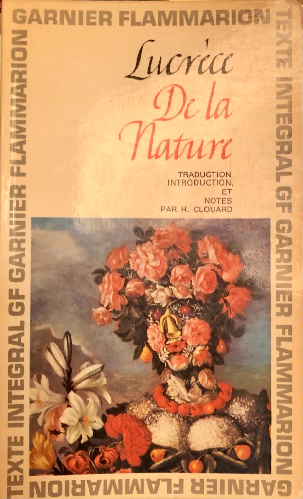 Dans les années 60, moi, petit gars de la campagne, je fis mes études classiques et je connus les écrivains de l’antiquité que j’ai immédiatement aimés. La clarté de leur raisonnement et leurs références à la nature me plaisaient particulièrement. J’ai conservé quelques livres de cette époque, dont une traduction le «De rerum natura» du romain Titus Lucretius Carus (94-54 av J.-C.).