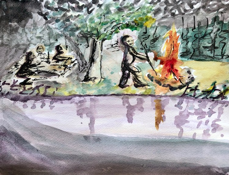 Au chalet cet été, je souhaite du mauvais temps. J’en ai assez du soleil et de la chaleur. Donnez-moi des nuages, du vent et de la fraîcheur. Mon vœu est exaucé ce matin. J’allume un feu de bois dans la Jotul, comme un petit feu de camp devant lequel je m’assois pour ma routine au lever. Puis, je sors et je m’installe sur la véranda. Le ciel est lourdement voilé et le vent agite l’eau du lac. Je suis enveloppé d’air vivant. C’est juillet et je n’ai pas à me parer du froid. Je me mets alors à dessiner.