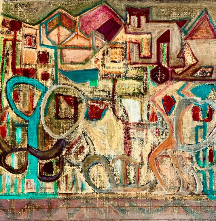 There are, in the original painting, recognizable forms of the physical world, which is a way of opening up to the other. I also see a desire to subsume reality by tracing lines and circles with a quick gesture. There is also something to do with geometric shapes, polysemous universal symbols.