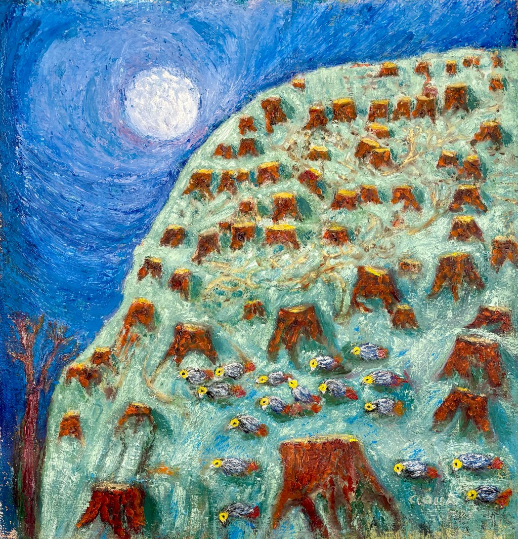 Trop de titres me sont venus à l’esprit pour que j’en choisisse un. Il y avait les titres descriptifs: le clair de lune, la déforestation de la colline et l’assemblée des oiseaux. J’ai aussi pensé que le tableau était une représentation symbolique d’une destruction urbaine par un bombardement et d’une population civile qui se retrouve sans abri.
